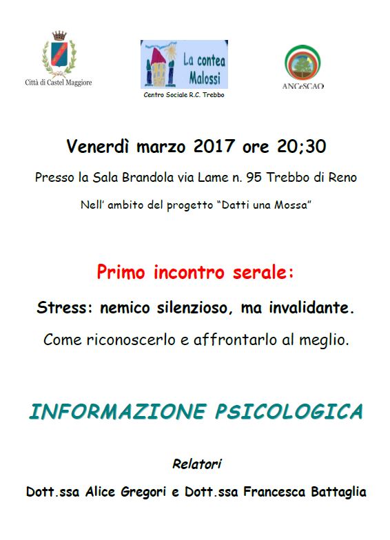 Nella prima serata, venerdì 3/03/2017, verrà trattato un argomento di rilievo nella vita di tutti i giorni “LO STRESS: NEMICO SILENZIOSO MA INVALIDANTE. COME RICONOSCERLO E AFFRONTARLO AL MEGLIO”.
