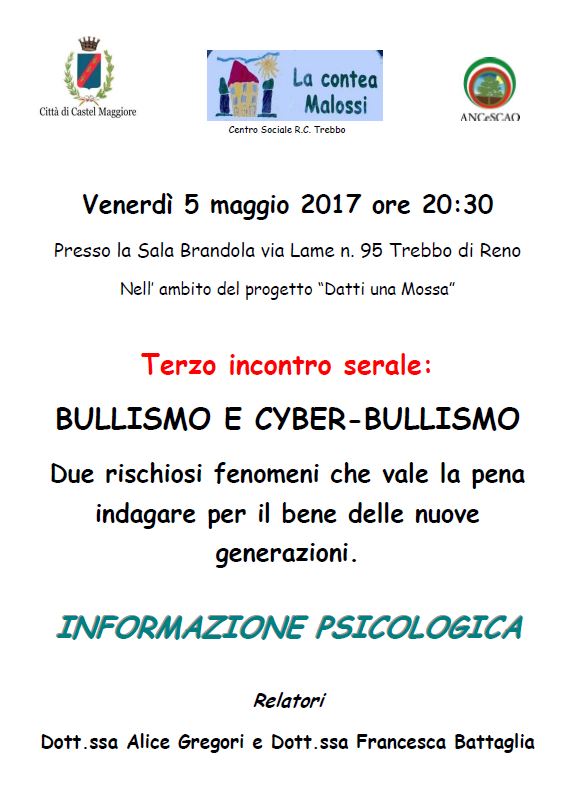 Il ciclo terminerà con l’ultimo incontro il giorno 5/05/2017 su: “BULLISMO E CYBERBULLISMO, DUE RISCHIOSI FENOMENI CHE VALE LA PENA INDAGARE PER IL BENE DELLE NUOVE GENERAZIONI”